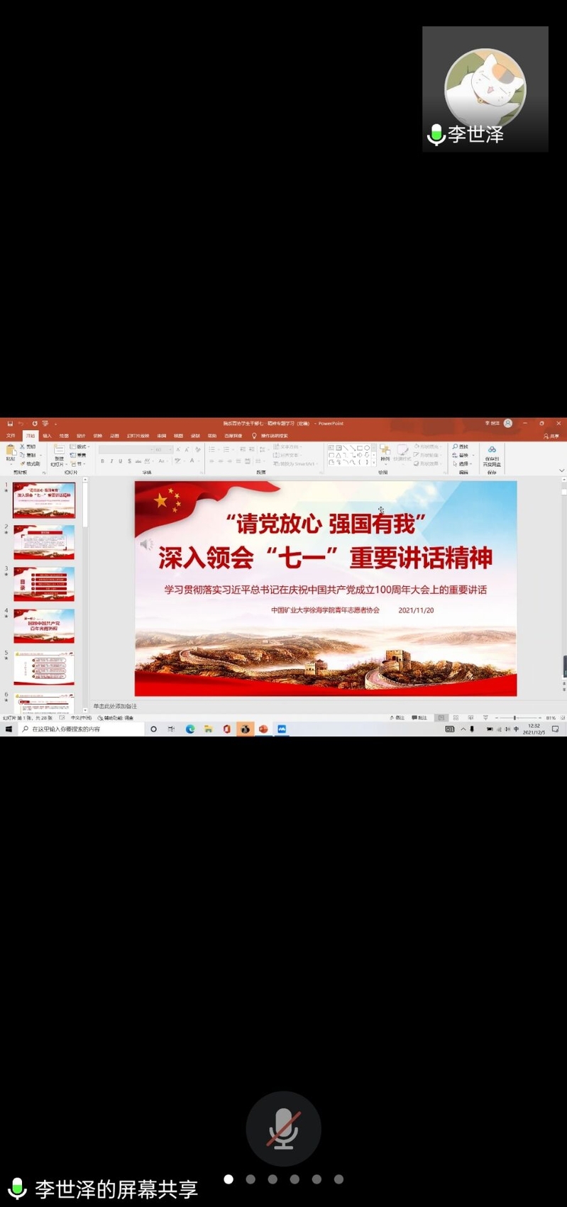 此次会议主讲人为:文艺系青协主席李世泽。会议开始,李世泽带领全体成员们回顾中国共产党百年光辉历程,四个伟大成就,中华民族迎来了从站起来、富起来到强起来的伟大飞跃,实现中华民族伟大复兴进入了不可逆转的历史进程!接着诠释中国共产党的伟大建党精神,坚持真理坚守理想、践行初心担当使命、不怕牺牲英勇斗争、对党忠诚不负人民。然后展望中华民族伟大复兴九个必须,以使为鉴、开创未来,必须坚持中国共产党坚强领导、必须团结带领中国人民不断为美好生活而奋斗、必须继续坚持和发展中国特色社会主义……接着寄语广大青年,未来属于青年,希望寄予青年。不负时代、不负韶华,不负党和人民的殷切期望!最后,李世泽号召全体成员,牢记初心使命、坚定理想信念,践行党的宗旨。