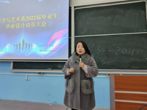 会议伊始,文艺系主任戴惠老师为我系2022届全体毕业生做毕业设计动员会演讲。她指出,这次大会标志着大家进入大学的最后一个阶段,同学们在思想上要高度重视,大学生涯是全方位提升升华的过程,与毕业设计环环相扣,任何一个环节都可能会对最后的结果产生影响。毕业设计是一个学以致用的过程,能够增长同学们的智慧与才干,同时可以形成团队合作的精神。接着,戴惠老师为同学们提出了如下三点要求:1.要合理分配利用时间与资源,要培养学术的前瞻性、敏锐的感知力、收集梳理升华文字的能力并心无旁骛,认真完成毕业论文。2.要做一个高度自律的人,珍惜大学美好生活,培养吃苦耐劳的精神,为进入社会做好准备。3.对未来有一个合理规划,脚踏实地,一步一个脚印,为大学生活画上圆满句号。