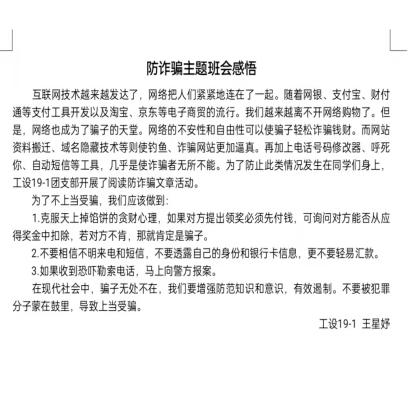 最后通过开展本次防诈骗主题教育班会活动,让同学们重视如何防骗、如何辨别真伪、如何对待可疑人员。既提高了同学们防骗的警惕性也让同学们树立正确的价值观和消费观。(撰稿人:邢嘉敏)