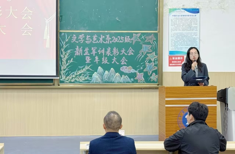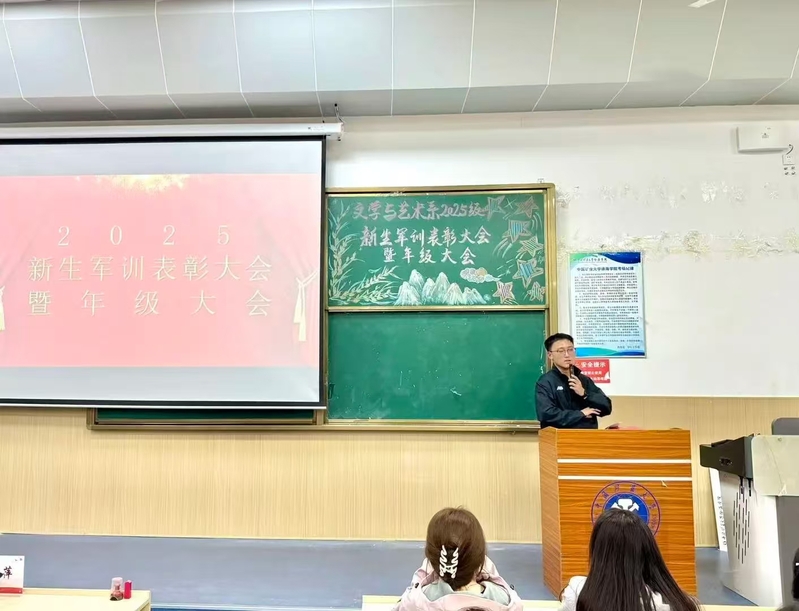 会议现场为表彰军训先进典型,进一步凝聚榜样力量。10月13日下午,文艺系在一南101召开了25级新生军训表彰大会。文艺系学工办主任朱治橙,25级辅导员鲁萍,24级辅导员、系学生党支部书记周宇宁,23级辅导员、系团总支书记杨安华,22级辅导员惠浩鸣,25级兼职辅导员张天平及全体25级新生参加会议,会议由25级辅导员鲁萍主持。