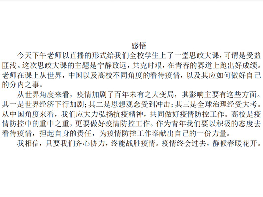 刘波书记的话让同学们受益匪浅,引发了广发共鸣,让同学们认识到疫情防控工作的不易,同时也意识到青年学生要在这一时期要勇于承担起肩上的责任。长风万里,中流击楫,在国家危难的时刻,平凡的青年一代勇立潮头,一往无前,用青春的澎湃和热烈,向社会传递不辜负“可堪大用、能担重任”的信号;青年要有“乱云飞渡仍从容,风雨无阻更向前”的理想信念。青年是国家和民族的希望。只有把理想信念融入“灵魂深处”,真正融入血脉、植入灵魂,成为精神上的主心骨、理论上的定盘星、行动上的指南针;青年要有“挽狂澜于既倒,扶大厦于将倾”的果敢担当。青年要有明知山有虎、偏向虎山行的壮举,在“难啃的骨头”面前勇于担当,磨砺意志,锤炼作风。面对新情况、新问题的不断涌现,要大胆探索不逃避,面对急难险重任务要快速决定不犹豫,面对困难矛盾和复杂局面要从容镇定不慌乱。