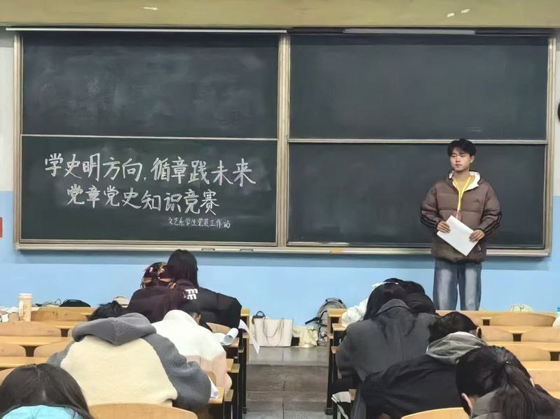 党章党史知识竞赛现场为鼓励同学们积极了解党的历史背景,传播正确价值观,文艺系学生党员工作站于2025年10月27日晚上分别在主北一和主北二召开了“学史明方向,循章践未来”党章党史知识竞赛。