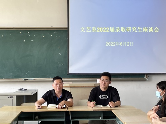 2022年6月2日上午10:30,文艺系在主楼204教室召开2022届考研代表座谈会。本次座谈会由王勇老师主持,文艺系学工办主任朱宁老师,以及文艺系2022届考研代表参加了本次座谈会。
