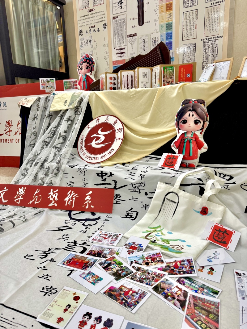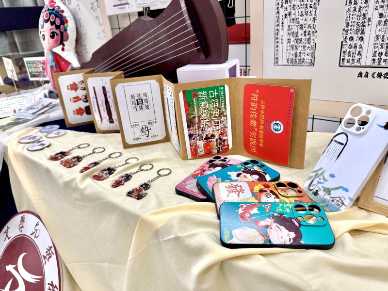 展览现场充分体现了“传统与现代共生”的理念:书写着书法笔触的纱幔与戏曲IP形象摆件、《诗经》主题展板巧妙呼应;卡片、帆布袋等文创产品,将古典文学与书法肌理等传统元素转化为兼具美学价值与实用功能的设计佳作。学生创作者深入挖掘传统文化的内在精神,借助排版设计、IP塑造等现代手法,重新诠释传统符号,让文化以更贴近当代语境的形态焕发新生。