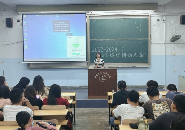 首先,鲁老师指出学校高度重视齐抓共管建立健全网络安全教育机制,普及了大学生防范网络诈骗的途径,提醒增强学生反诈意识,做好自身安全的“第一责任人”。其次,是文明校园的重要组成部分,也是环境育人的重要抓手,提高大学生健康生活意识和文明卫生素质,有效预防和控制传染病的发生。另外,为规范学生作息时间,严格执行开学以来,对寝室内在晚上的拍照检查制度。严格违规电器排查,进一步加强学生宿舍的安全工作管理力度,防范宿舍各类安全事故的发生,排查治理各个宿舍安全隐患。最后,从新学期工作部署,提出要进一步加强学科建设,聚焦重点学科方向,达成学年目标。另外,学生代表郑玛莲同学也分享了假期丰富的生活经历,鼓励同学们的进一步明确自己的未来发展目标,做好学业及生活规划,以更加奋进和自信的心态迎接各种挑战和机遇,充实地度过新学期。