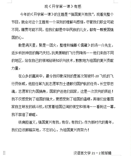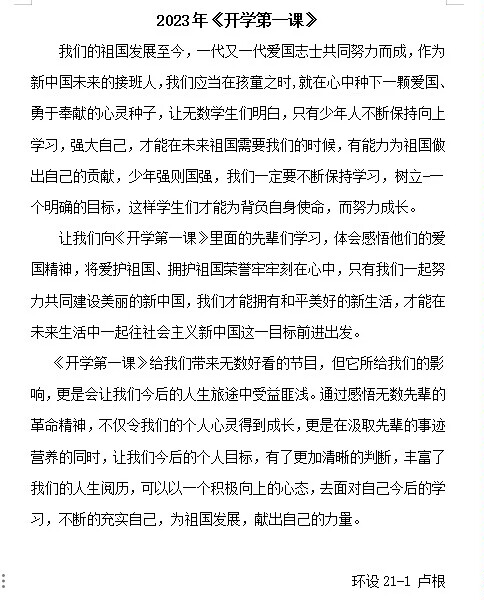 2023年的《开学第一课》主题为:强国复兴有我,节目邀请了许多杰出人物,如“八一勋章”获得者、二十大代表、时代楷模、航天员、科学家、文化学者、一线劳动者代表等同志,通过他们富有感召力和影响力的人生经历和奋斗足迹,传播知识,传授美德,培育学生们的社会主义核心价值观,让广大青少年感受到社会主义的优越性和当下时代传递出的价值导向——强国复兴有我。此外,《开学第一课》还强调了传统文化的重要性。文化学者们通过讲述和解读经典文学作品,传承和弘扬中华优秀传统文化。我系学子还认为要自觉传承和弘扬中华优秀传统文化,这是我们作为中华民族一份子的责任和义务。