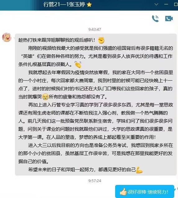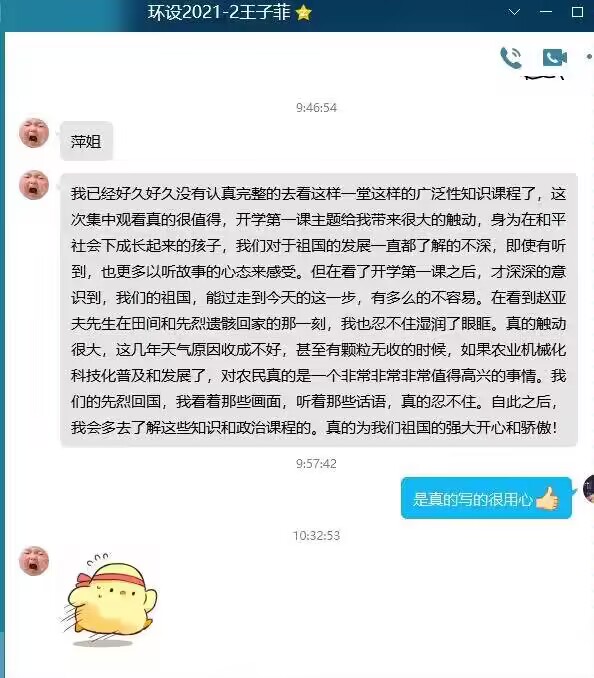 时代呼唤勇担当,扬帆奋进正当时。通过此次观影,我系学子看到了专属于中国人身上的勇气,骨气和志气,更看到了个人,国家与时代的密切关系。生在新时代下,拥有着前所未有的好条件,面对着前所未有的好机遇,千千万万个奋斗者的梦想为不断实现中国梦添砖加瓦。(撰稿人:赖子寒)